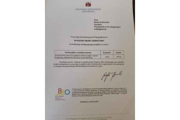 Miło nam poinformować, że nasza Placówka otrzymała Bydgoski Grant Oświatowy pt. "Emocje mamy i się im przyglądamy - konkurs miejski".