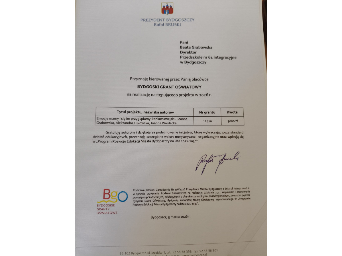 Miło nam poinformować, że nasza Placówka otrzymała Bydgoski Grant Oświatowy pt. "Emocje mamy i się im przyglądamy - konkurs miejski".
