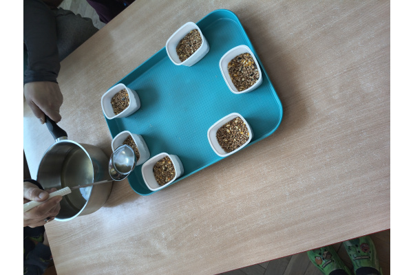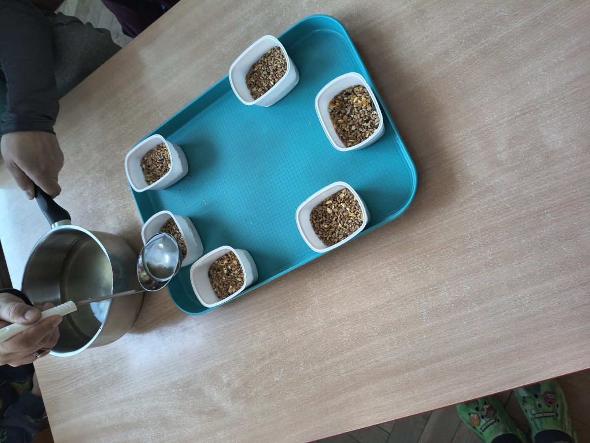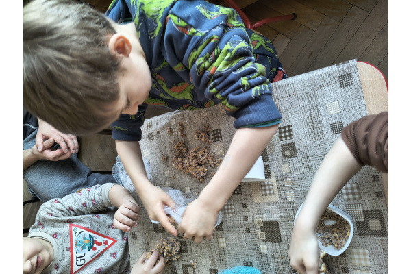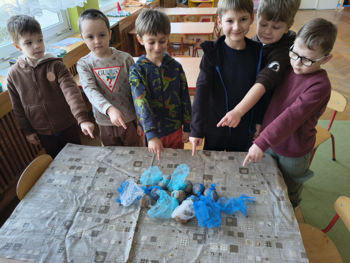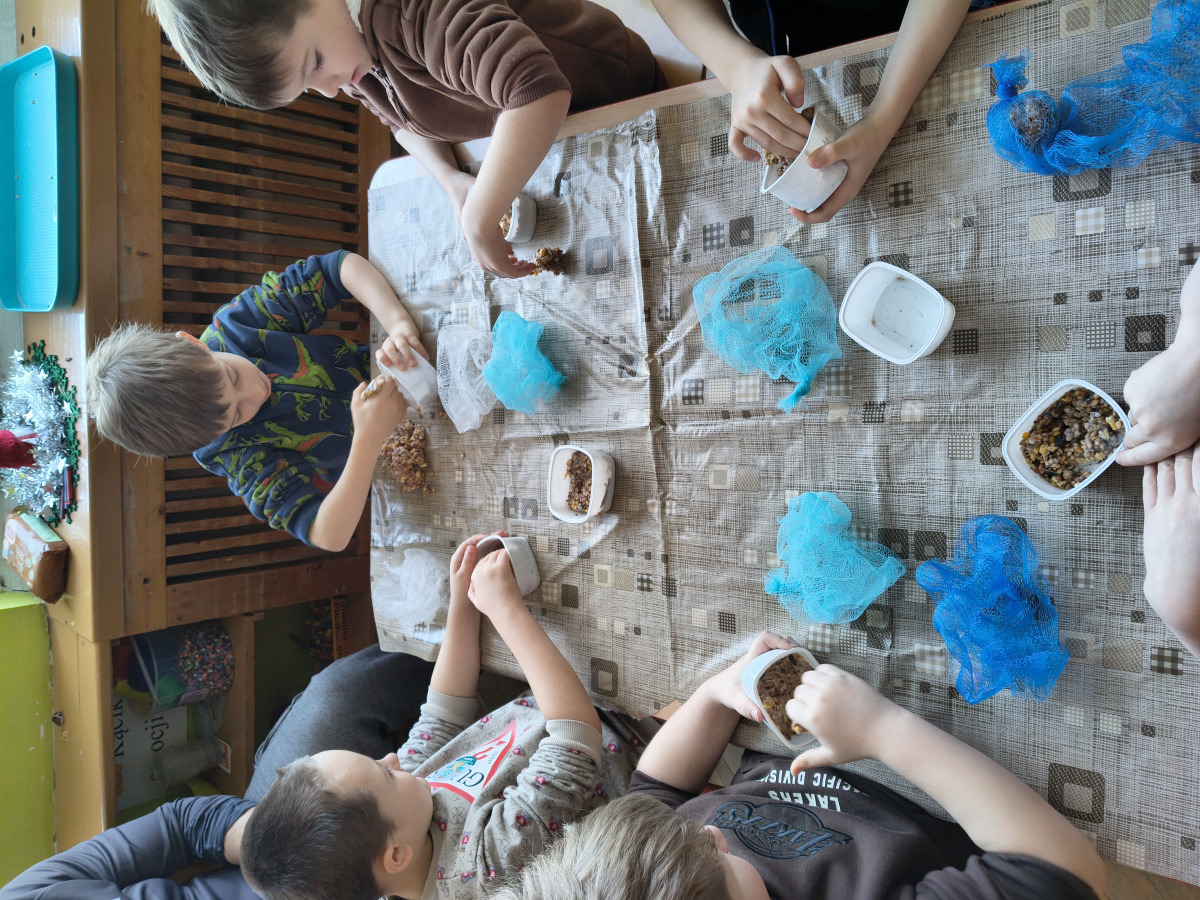 Dzięki uprzejmości i pomocy rodziców Przemka, grupa V wykonała kule tłuszczowo-ziarenkowe dla ptaków