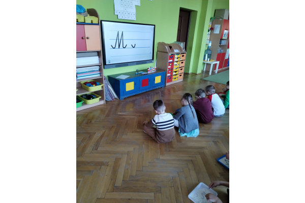 Dzieci z grupy 5 do nauki liter wykorzystują różne metody, m.in. korzystamy z tablicy multimedialnej do śledzenia właściwego sposobu pisania litery, piszemy litery na tackach z mąką i wypełniamy tradycyjne karty pracy.