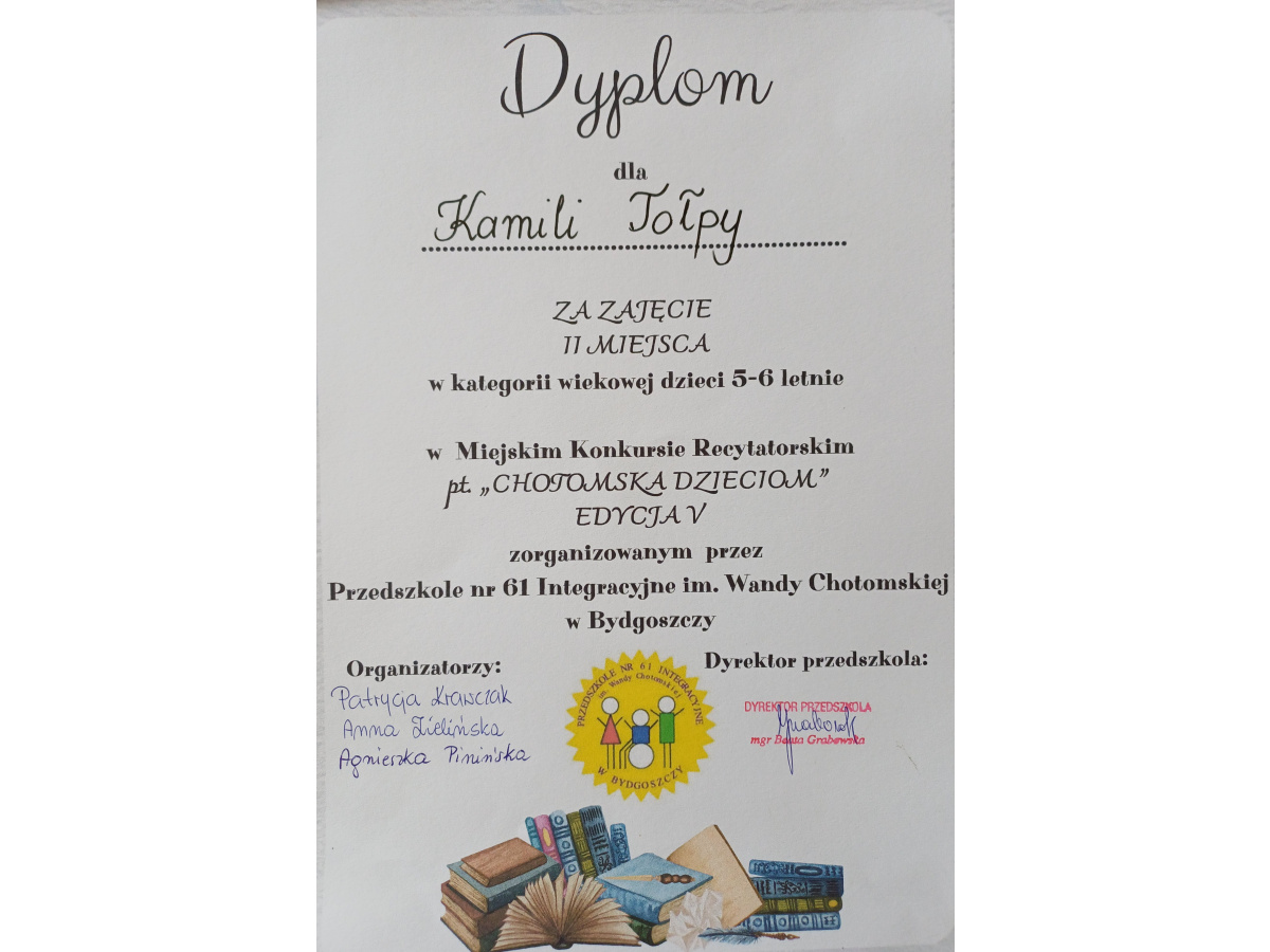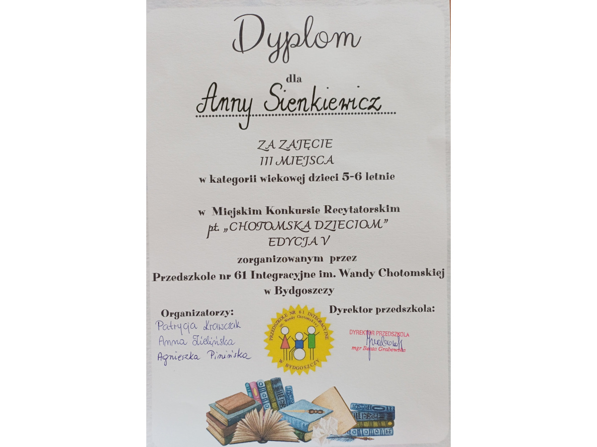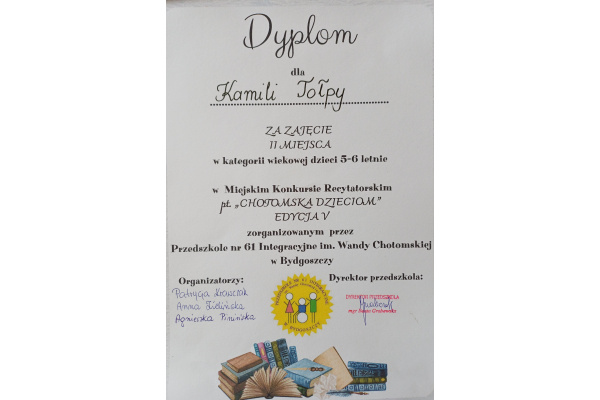 Laureatkami V edycji Miejskiego Konkursu Recytatorskiego "CHOTOMSKA DZIECIOM" zostały dziewczynki z naszego przedszkola.