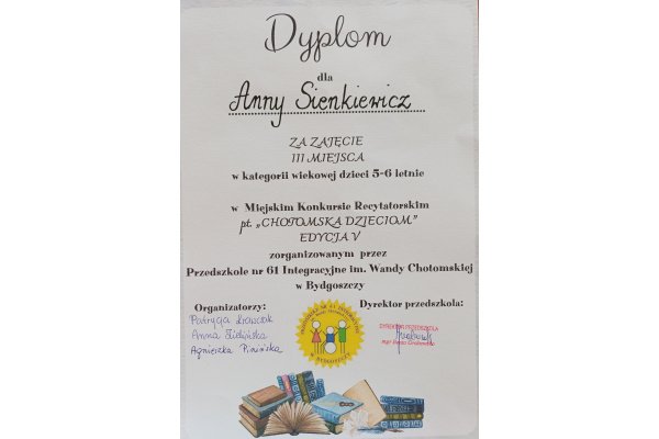 Laureatkami V edycji Miejskiego Konkursu Recytatorskiego "CHOTOMSKA DZIECIOM" zostały dziewczynki z naszego przedszkola.