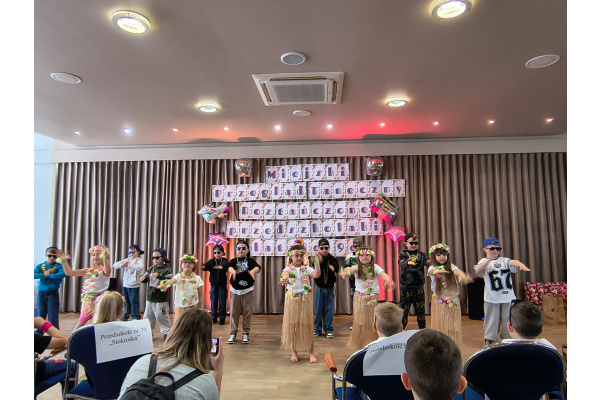 W minioną środę w Miejskim Domu Kultury "Modraczek" odbył się Miejski Przegląd Taneczny „Roztańczone Przedszkolaki – Lata 80. i 90.”, który został zorganizowany przez nasze Przedszkole. Dzieci zaprezentowały układy inspirowane największymi hitami lat 80. i 90., łącząc taniec, zabawę i kreatywność. Wydarzenie miało na celu rozwijanie pasji tanecznych, integrację przedszkoli oraz wspólne świętowanie poprzez muzykę i ruch w atmosferze pełnej energii i uśmiechu.