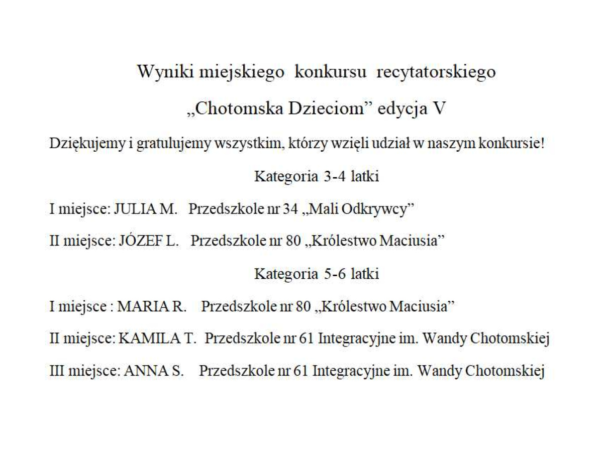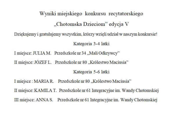 Wyniki miejskiego konkursu recytatorskiego: "Chotomska Dzieciom" - edycja V